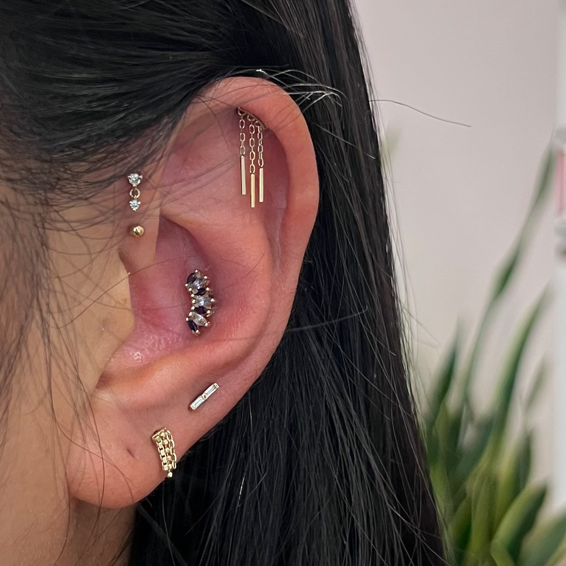 This threadless end comes with two bright diamonds in a cascading dangling duo. Perfect across the ear in a helix, tragus, and more!
