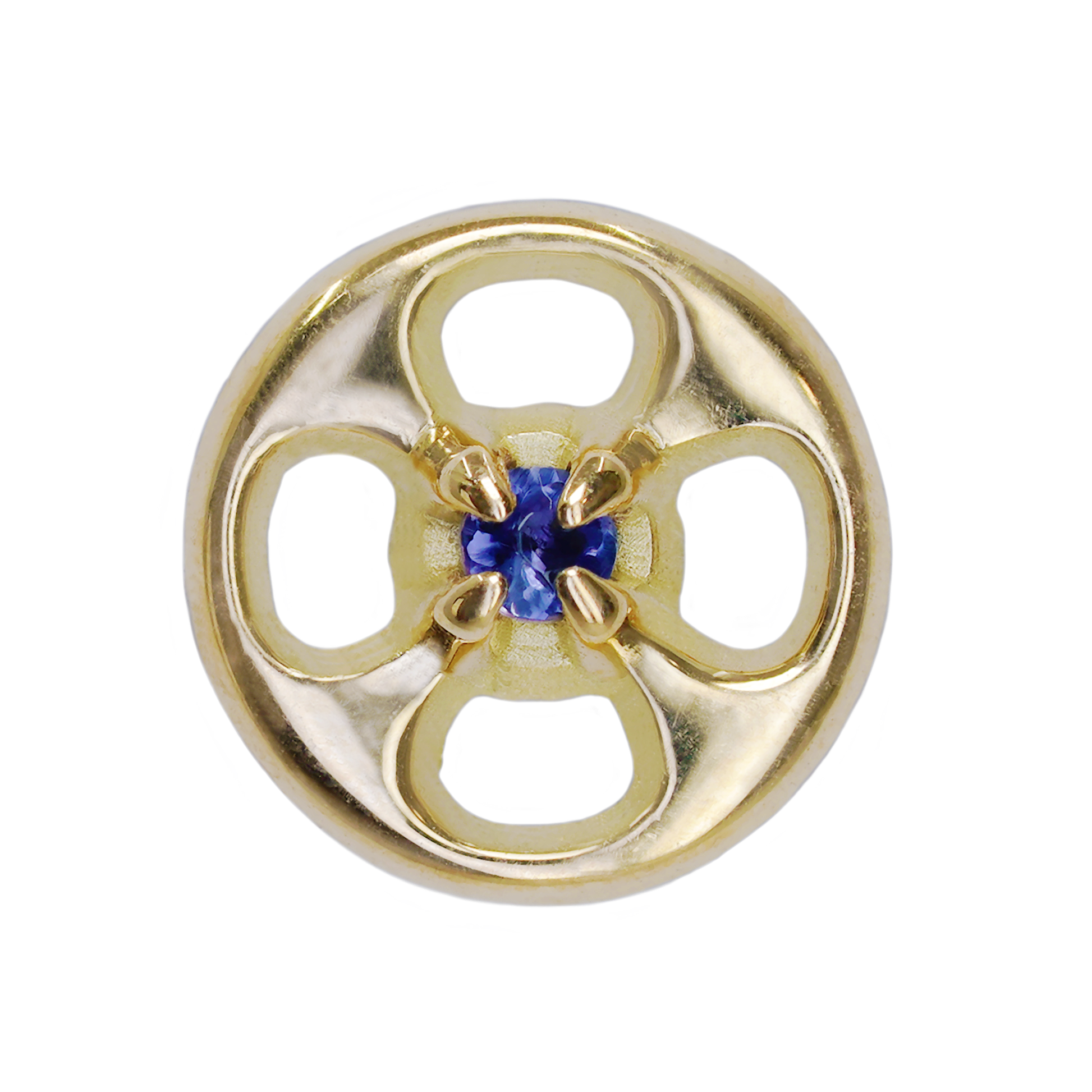 New in from Sacred Symbols, this polished gold button-shaped threadless end has a prong set blue sapphire at its center.