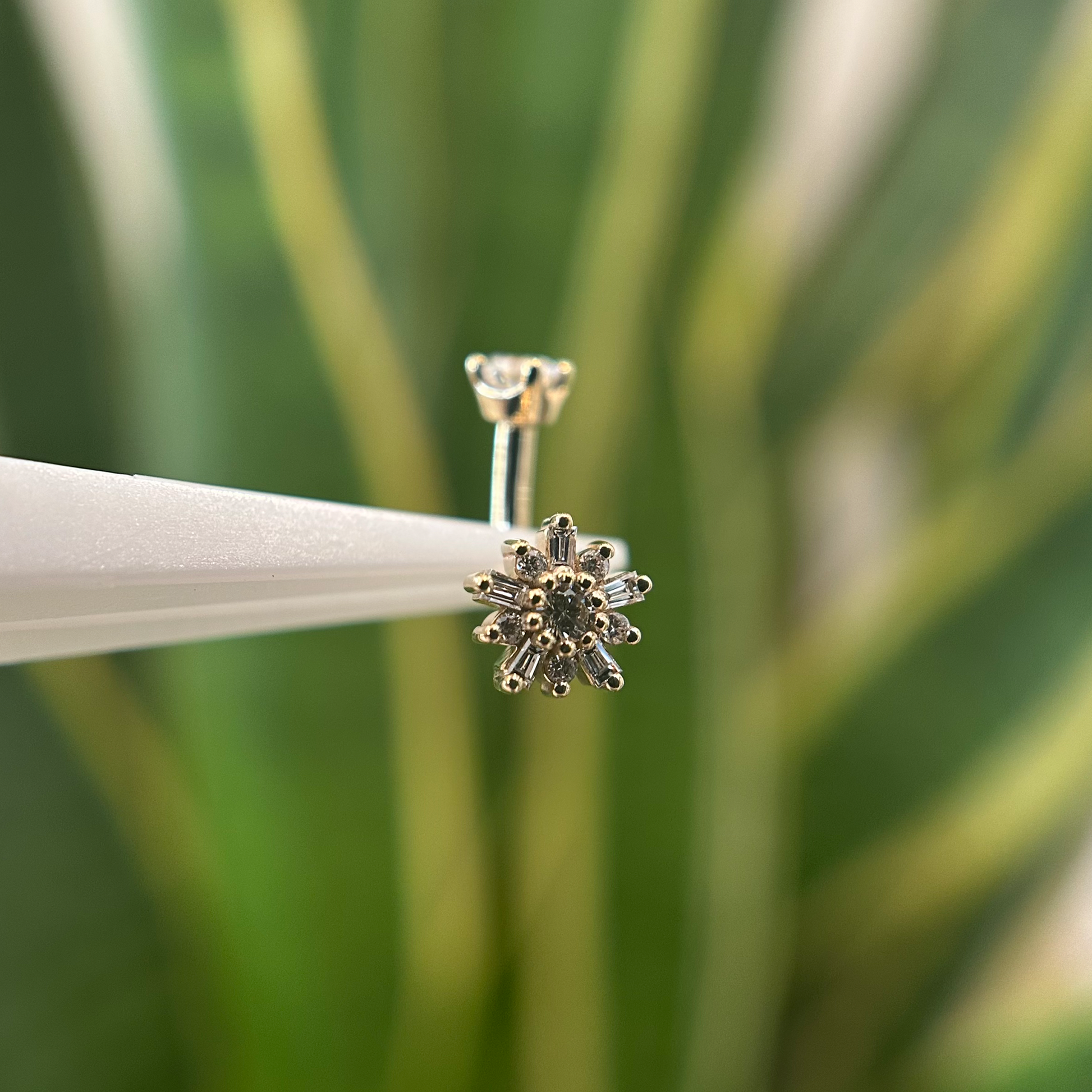 Deck out your rook piercing with this Elaine barbell with lots of sparkly white diamonds. The bottom is BVLA's beloved 5.5mm Elaine end and the top is a classic 3mm diamond.