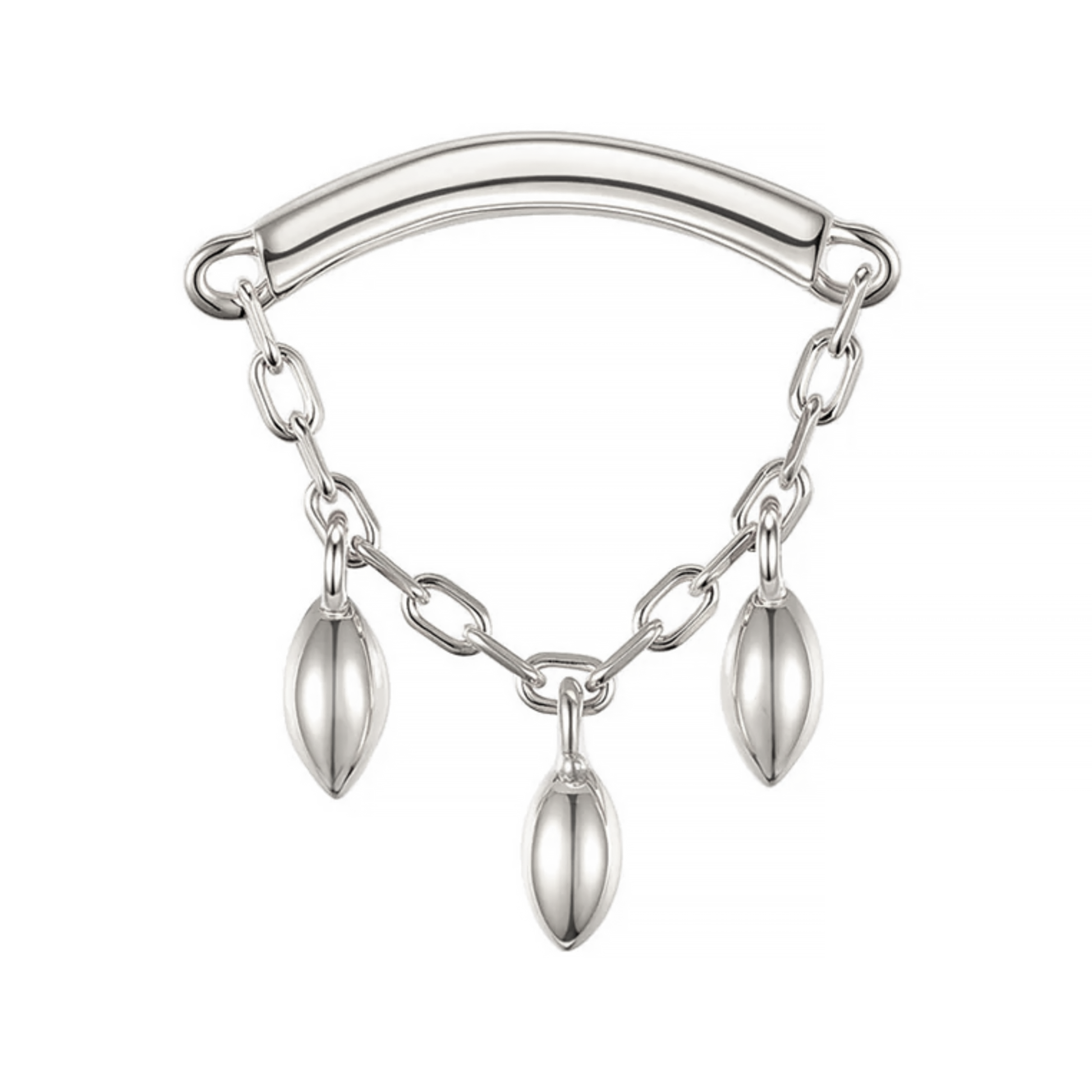 New from Modern Mood! This curved bar threadless end features a chain, dripping with marquise-shape beads.