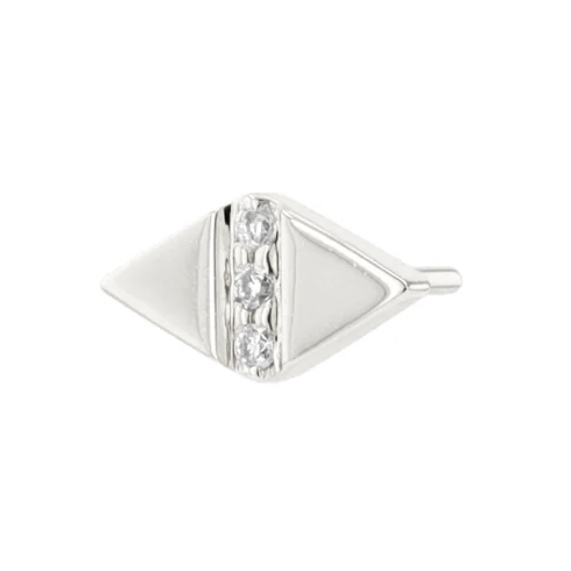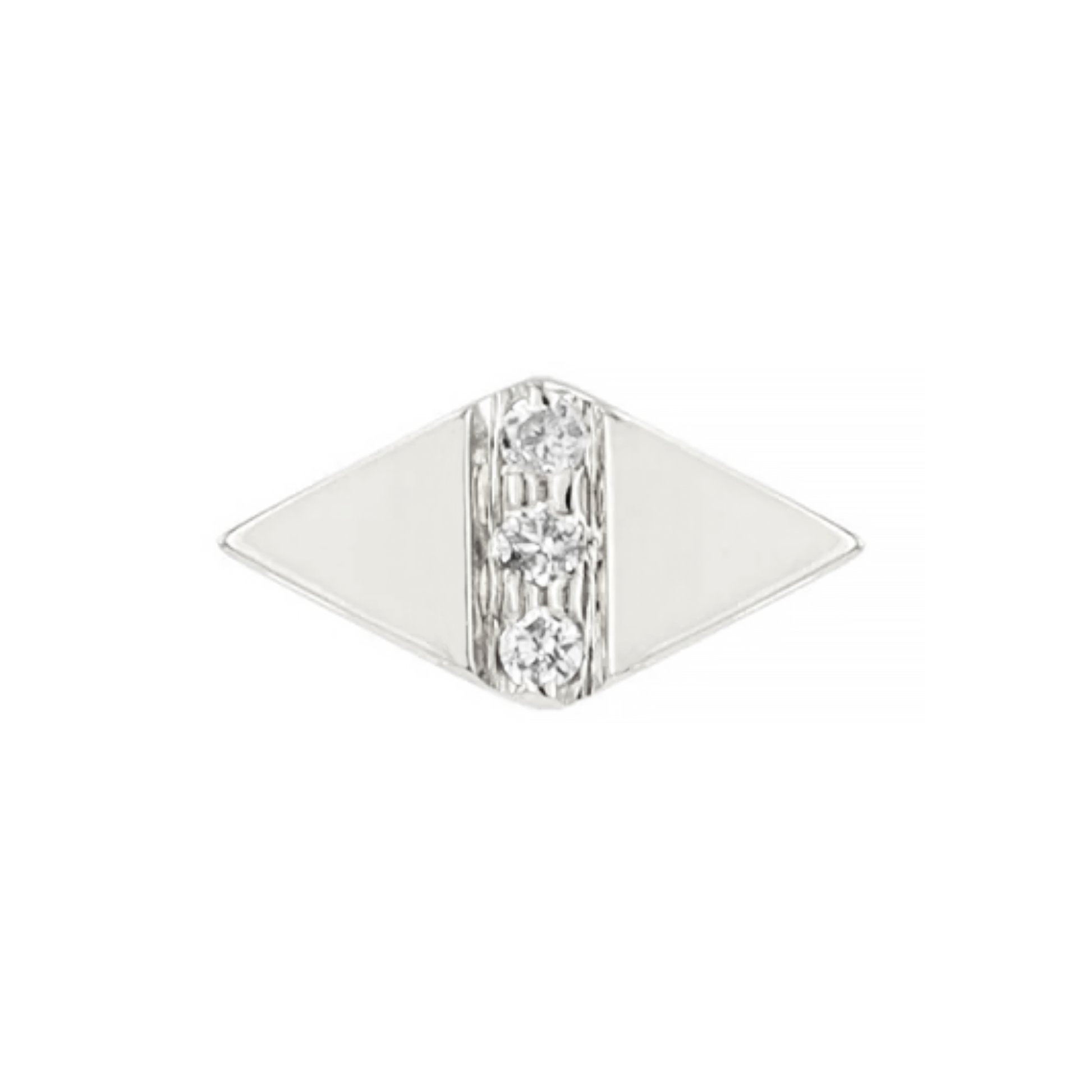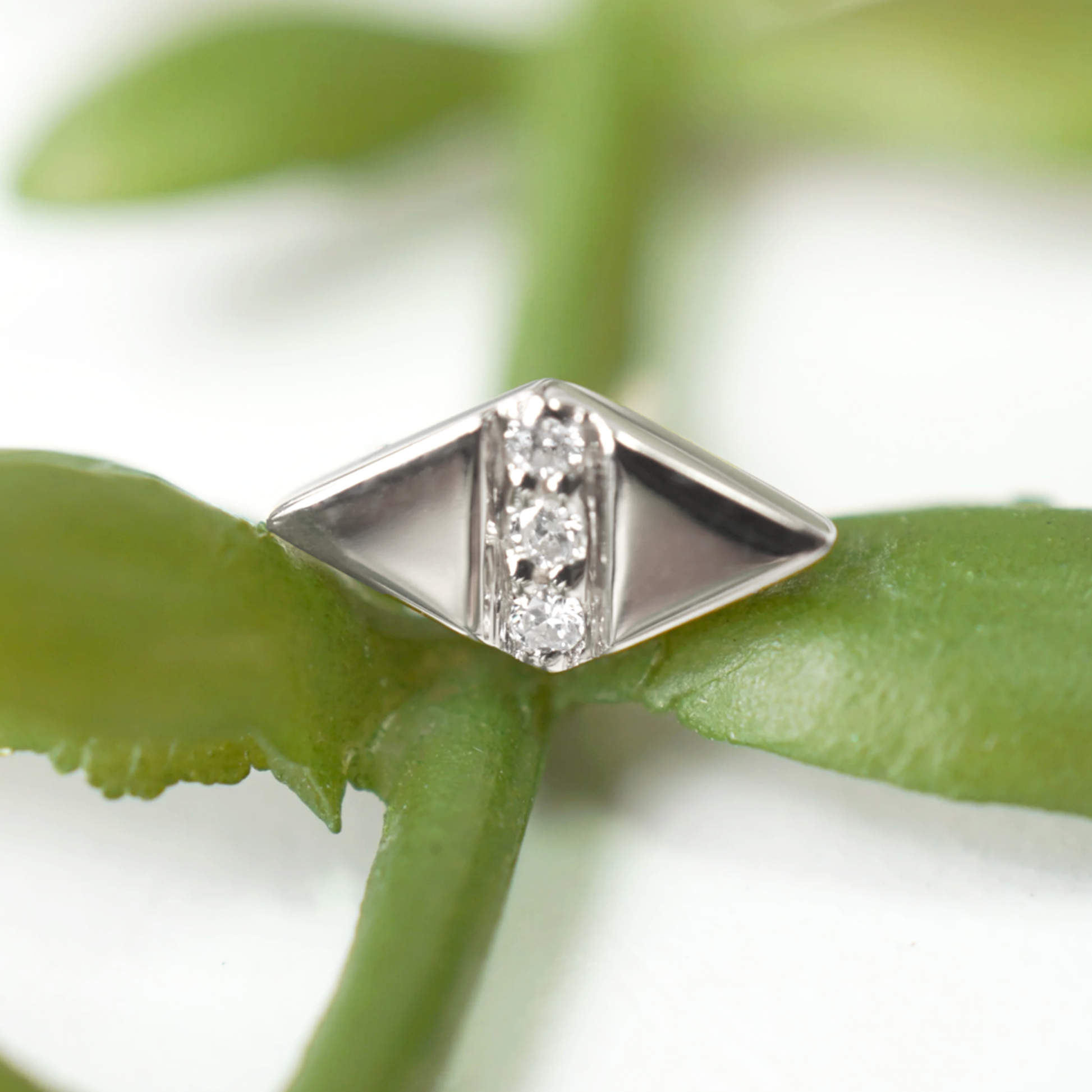 From Modern Mood, the Mini Venus threadless end is a rhombus shape with three pavé diamonds down its center.