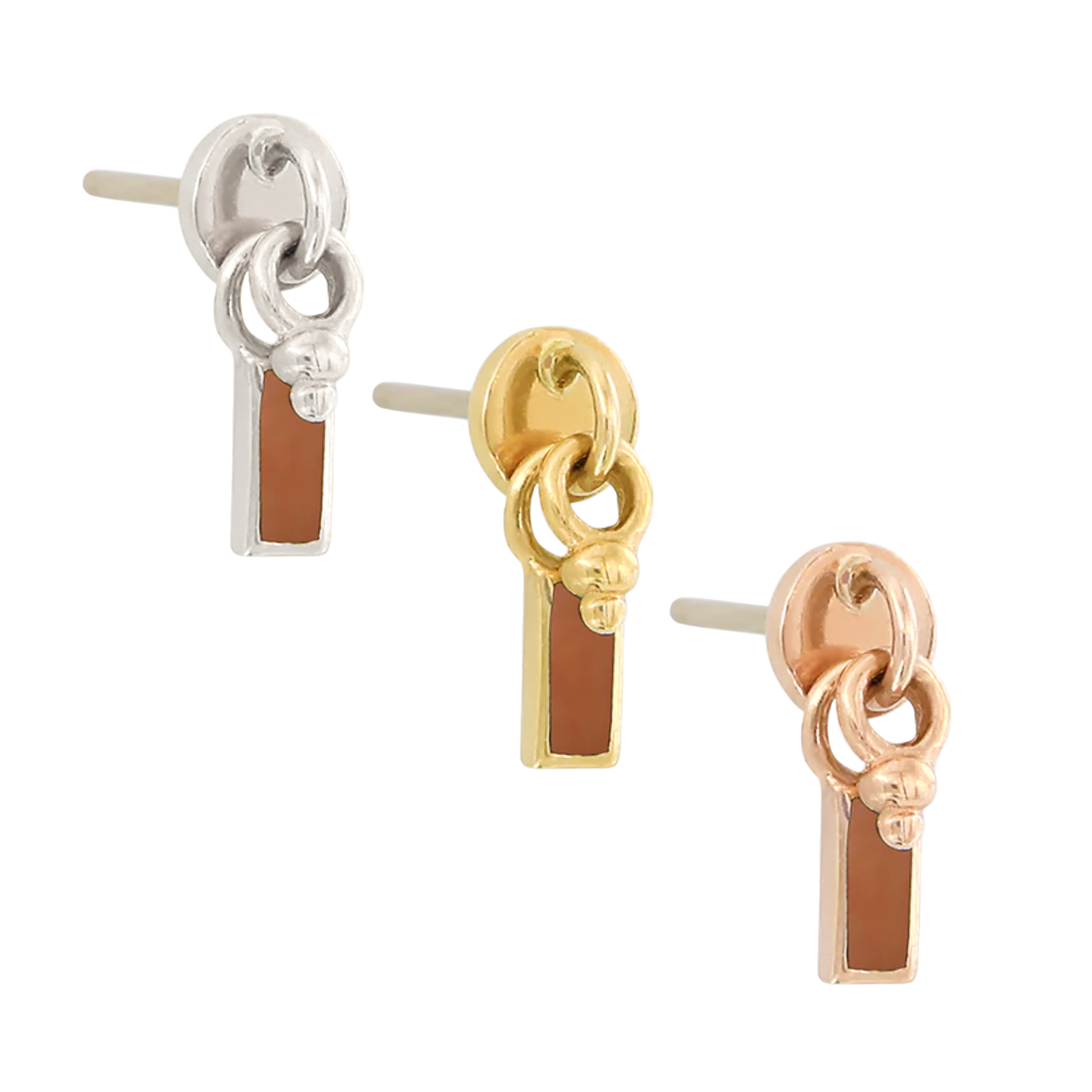 New in from Pupil Hall, this threadless end features a round base with a rectangular brown enamel charm and bead dangles.