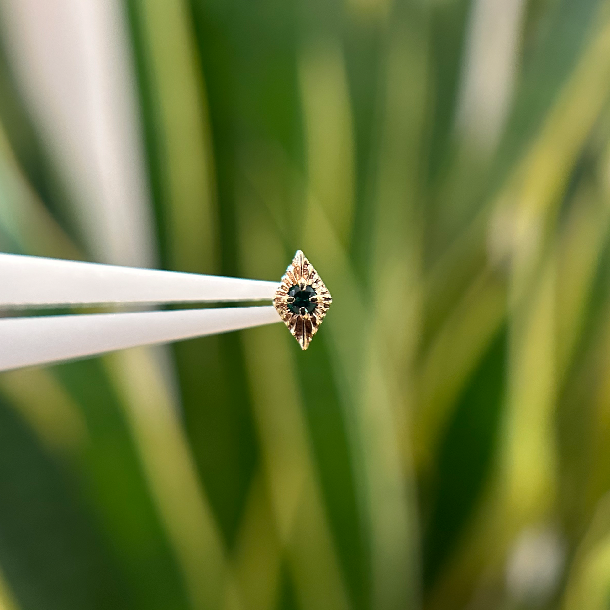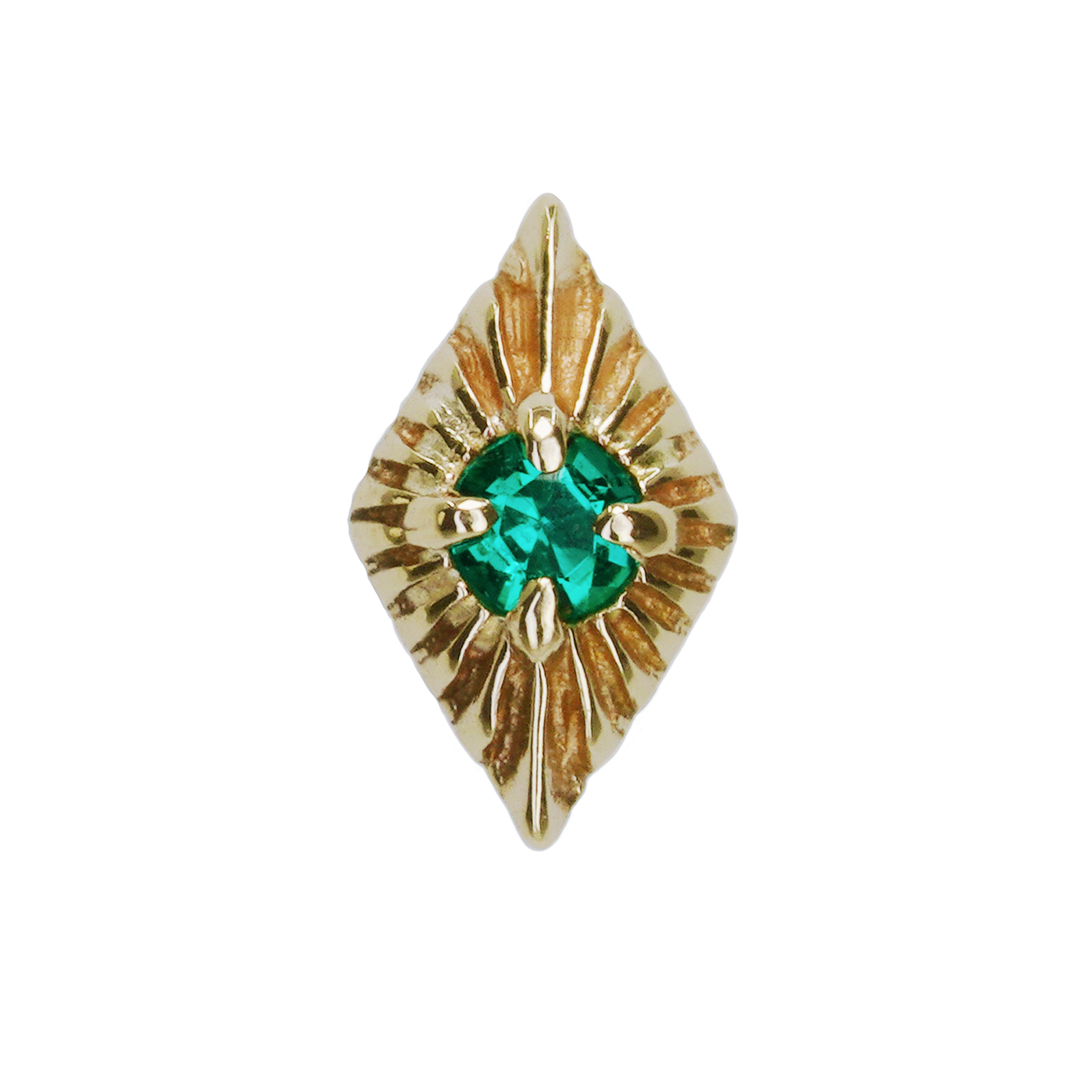 One of Sacred Symbols' beloved threadless ends, this deco rhombus has a vibrant emerald at its center.