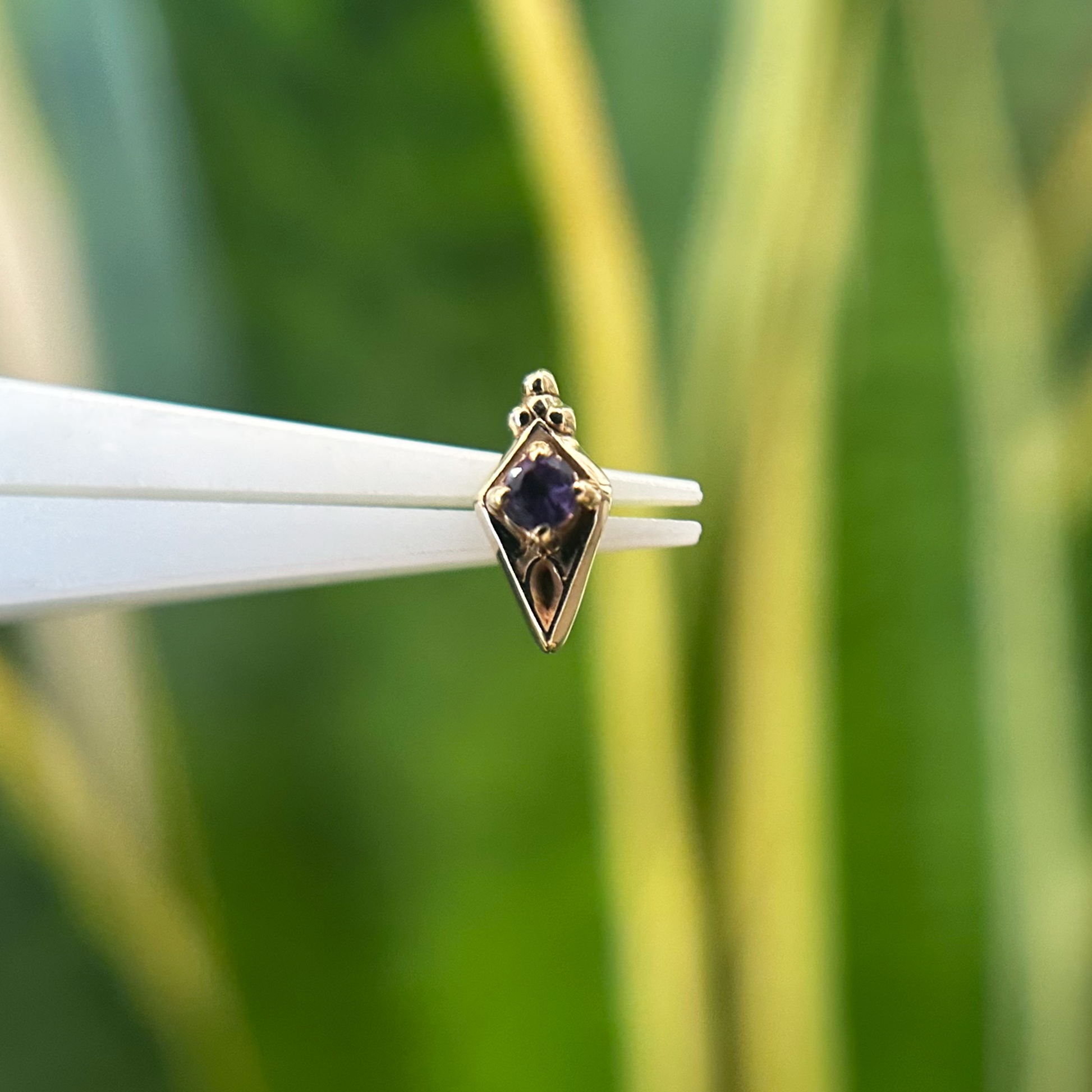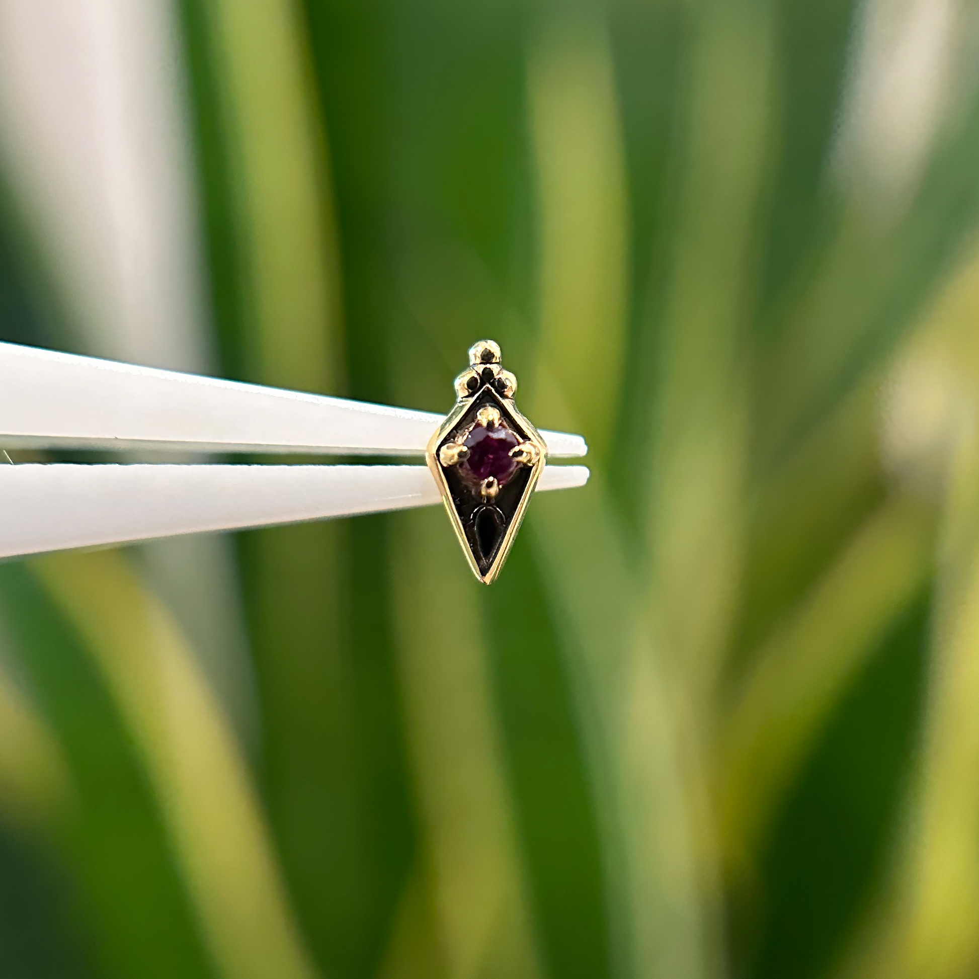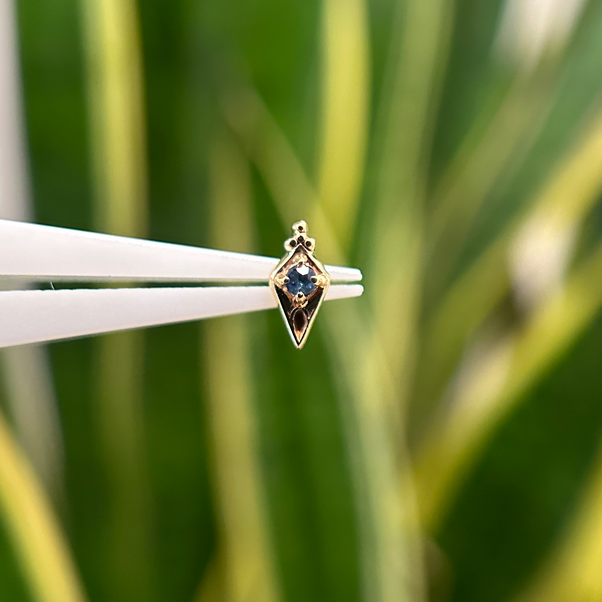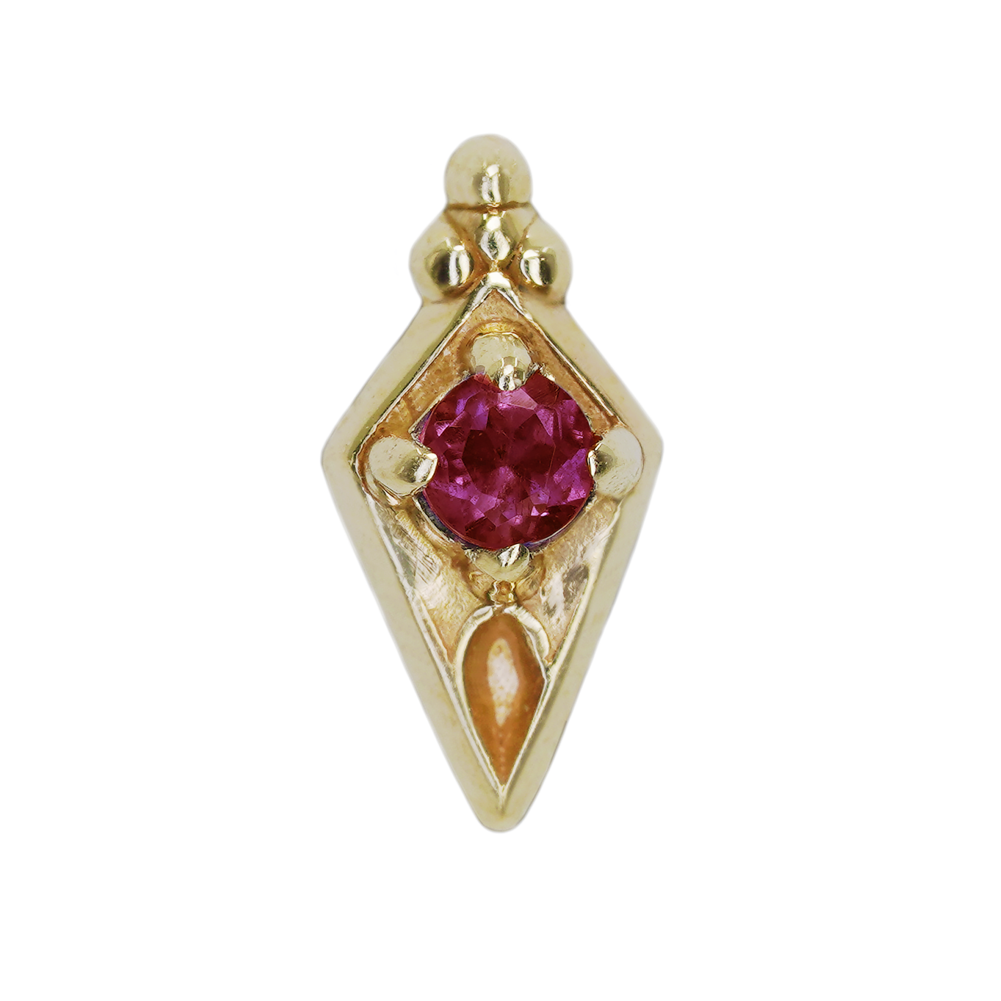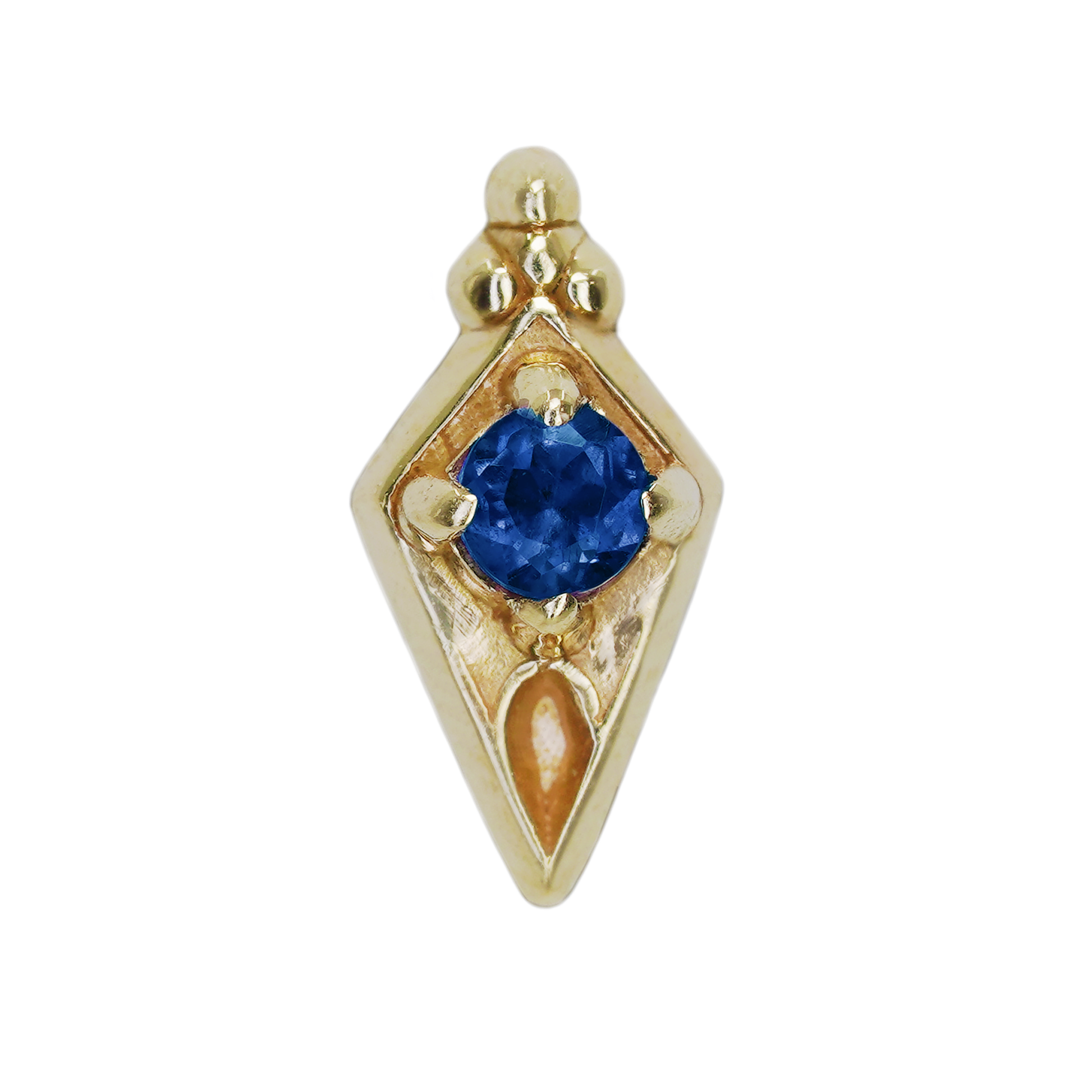 New in from Sacred Symbols, these rhombus-shaped threadless ends feature a round gemstone at their center and a tri bead accent at the top.