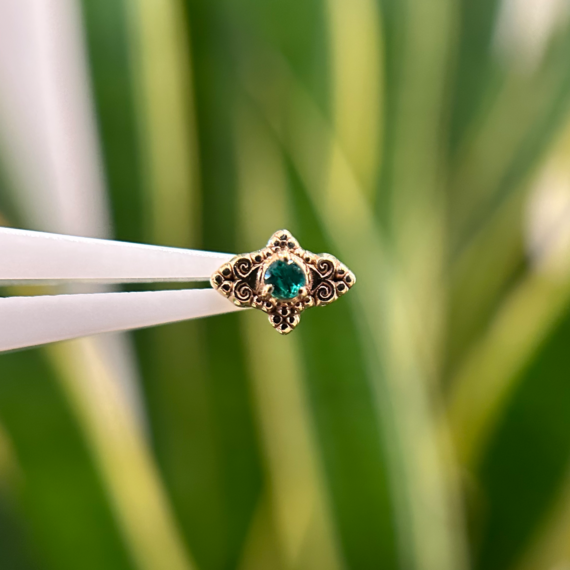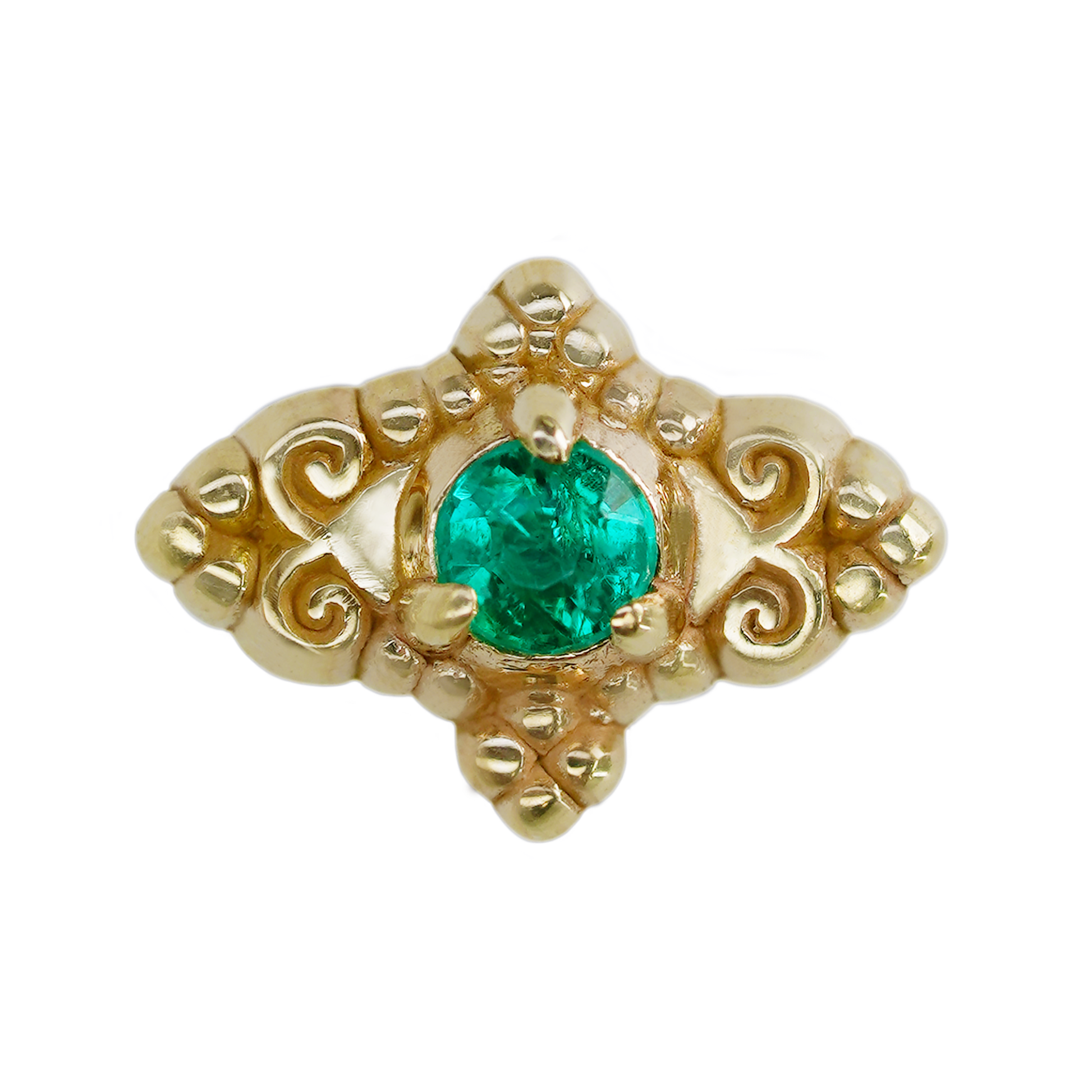 From our latest Sacred Symbols drop, this swirled gold threadless end features an emerald at its center.