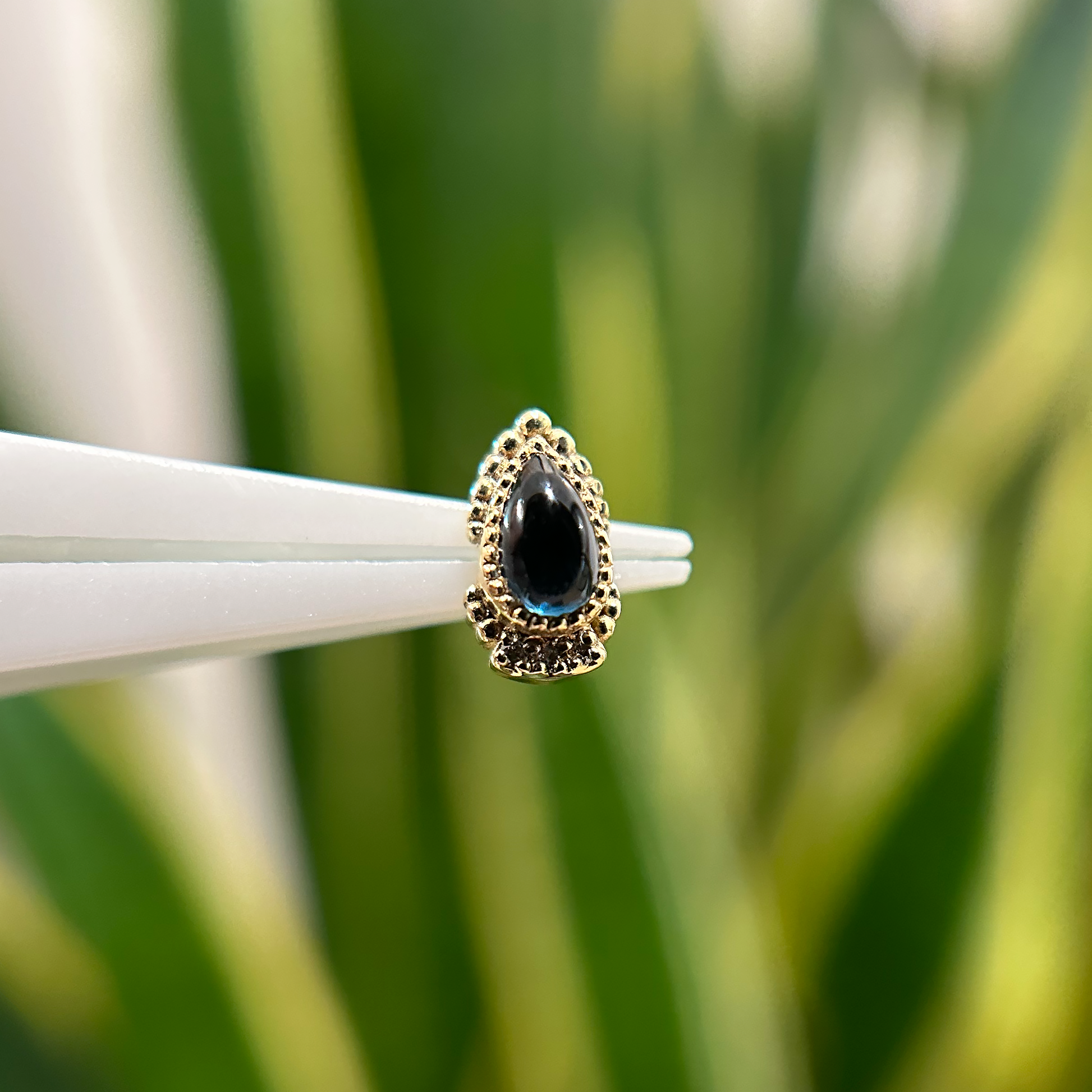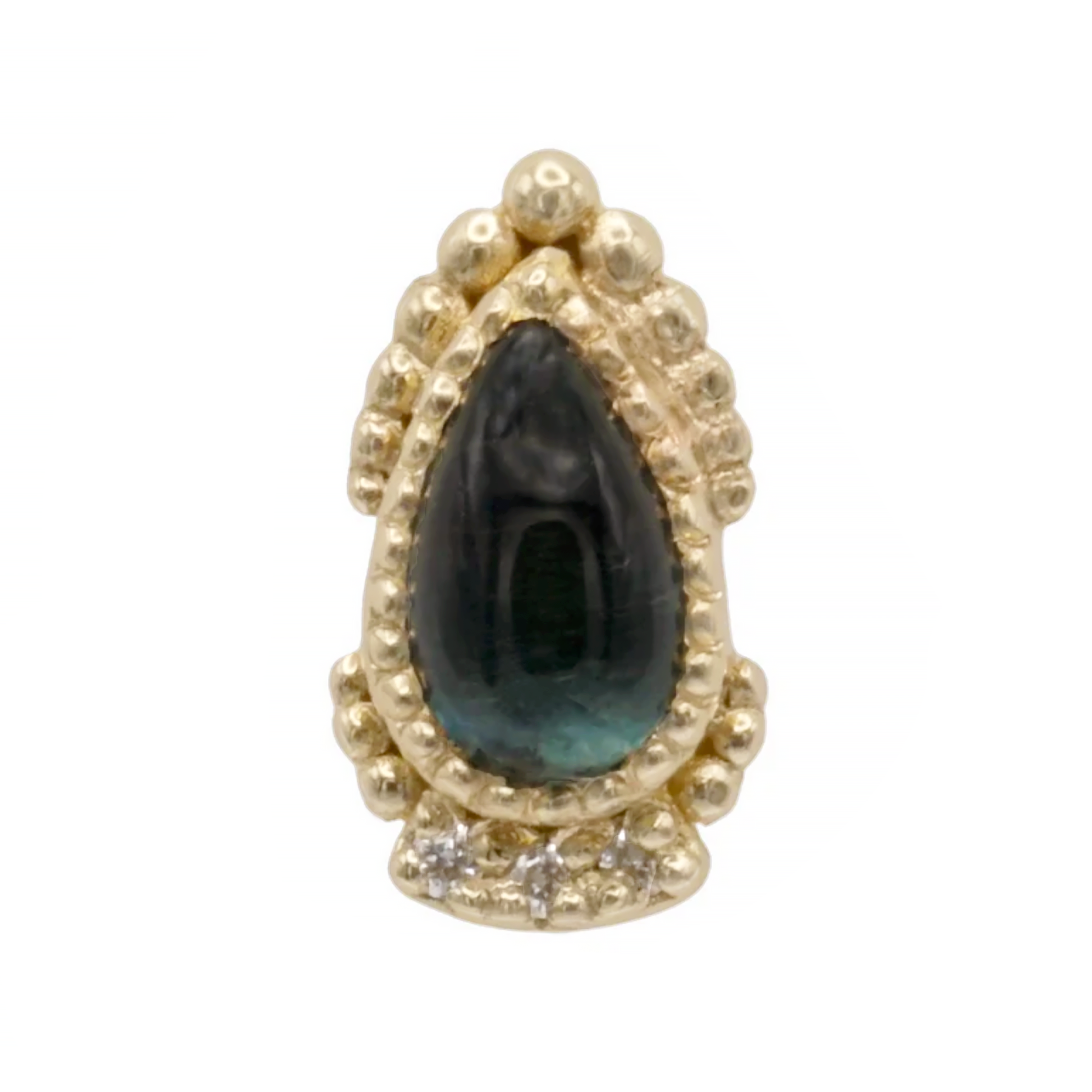 New in from Seasons, the Glados threadless end features a pear shaped London blue topaz cabochon in a beaded bezel setting.